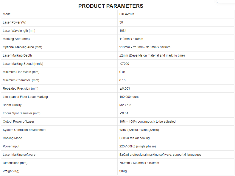 产品特点是台式光纤激光打标机是第三代激光标记系统。采用光纤激光器输出激光,通过高速扫描电流计系统实现标记功能。光纤激光标记具有电光转换效率高、空冷、体积小、材料广泛等特点,广泛应用于不锈钢手机覆盖层、钟表、模具、IC、手机键盘等领域。位图标记可以在金属和塑料表面刻出漂亮的图像,标记速度是传统的第一代灯泵标记和第二代半导体标记的3~12倍。光纤用于输出激光,具有很高的特性。
